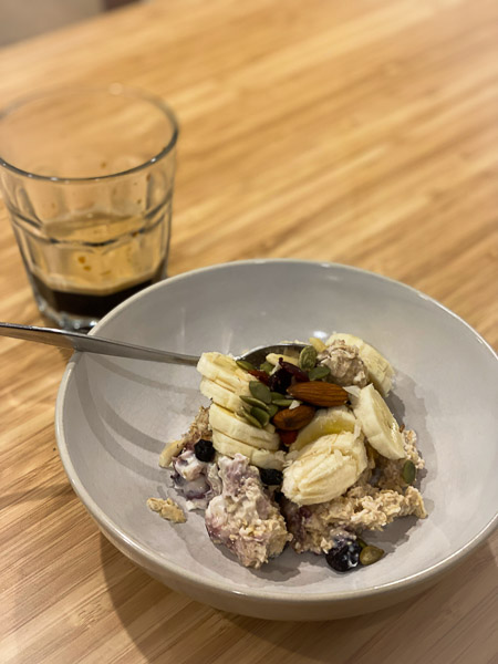 I’m boosting what I eat because I’ll need the energy so I started with a better breakfast. The overnight oats had blueberries and cranberries added. Some peanut-free trail mix sprinkled over and some sliced banana added. I was so full I barely ate lunch.